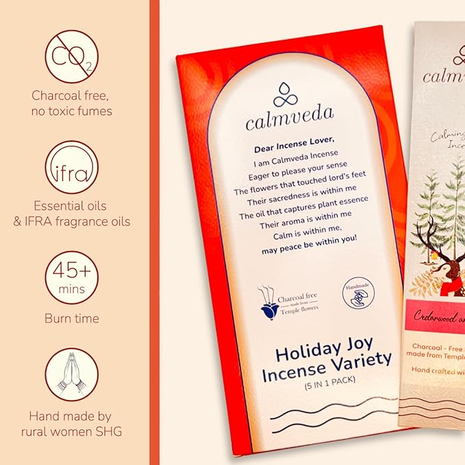 Celebrate the season with Calmveda Fall Scented Incense Sticks, crafted to capture autumn’s warmth and festive spirit. This organic variety pack includes cozy aromas like cedar, vanilla, rose, jasmine, and candy cinnamon, filling your space with positive vibes and harmony. Perfect for gatherings, meditation, or gifting, these natural incense sticks create a soothing, woodsy ambiance. Handcrafted for safe, clean burning, they elevate holiday traditions and transform your home into a haven of joy.